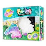 De set met een platte figuur van een eenhoornhoofd bevat: 5 kleuren, een penseel, 2 papieren bakjes.