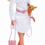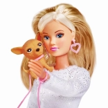 Stijlvolle pop STEFFI LOVE in een glinsterende jurk met lange mouwen en accessoires, waaronder een hartjesriem en oorbellen, komt samen met een schattig hondje, een chihuahua aan de lijn. Perfect voor creatief spel, modieuze verkleedpartijen en rollenspelscènes.
