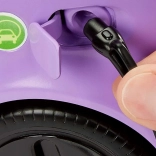 De auto heeft een stijlvol paars ontwerp met realistische details, inclusief veiligheidsgordels en een achteruitkijkspiegel.