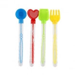 Vier verschillende handvatvormen: cirkel, hart, vierkant en vork, in de kleuren blauw, rood, groen en geel.