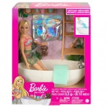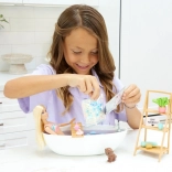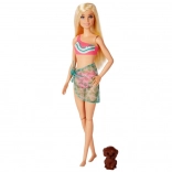 Barbie met 7 beweegpunten in kleurrijke badkleding en pareo kan heerlijk ontspannen in het bad. Het hondje ontbreekt niet voor extra verhaaltjes.