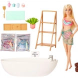 Deze badset biedt kinderen vanaf 3 jaar kleurrijk, geurig en rustgevend speelplezier. De Barbie-pop in badkleding met transparante pareo heeft 7 beweegpunten voor natuurlijke poses. Twee hersluitbare zakjes confetti in roze en blauw kleuren het water in het bad en creëren bij het mengen een paars bad.