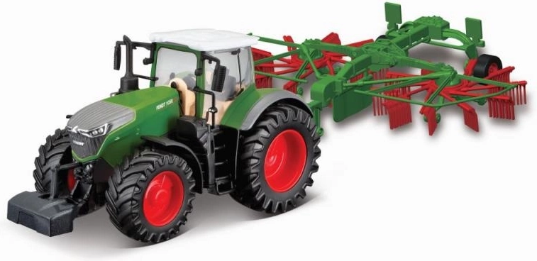Model van de landbouwtractor Bburago Farm Tractor Fendt 1050 Vario met schudder (hooikeerschudder), gemaakt van metalen en kunststof onderdelen, gebaseerd op het voorbeeld van de tractor uit de topserie 1000 Vario.