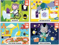 Met de set Mudpuppy Level Up! wonderlijke beroepen – kinderpuzzel 4-in-1 genieten kinderen van puzzels met oplopende moeilijkheid: 16, 20, 24 en 28 stukjes. Elk beeld van illustratrice Eloise Narrigan toont fantasierijke beroepen die zowel verbeelding als fijne motoriek stimuleren.