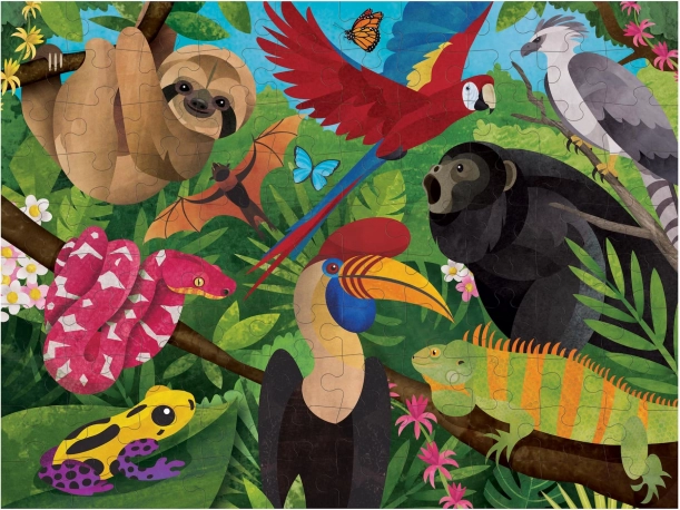 De puzzel biedt twee verschillende scènes uit het leven in het regenwoud, wat dubbel zoveel plezier en leren oplevert.