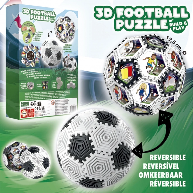 Zbuduj i baw się z oryginalną dwustronną 3D układanką w kształcie piłki nożnej. Po złożeniu otrzymujesz solidną i funkcjonalną piłkę, którą można ozdobić piłkarskimi naklejkami i użyć do zabawy.