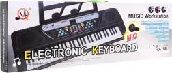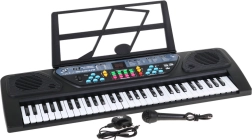 W zestawie znajduje się mikrofon, pulpit na nuty oraz instrukcja obsługi. Wymiary keyboardu to ok. 70 cm x 23 cm x 7 cm, co umożliwia wygodne ustawienie na biurku. Dzieci mogą rozpocząć swoją muzyczną przygodę dzięki temu wszechstronnemu instrumentowi.
