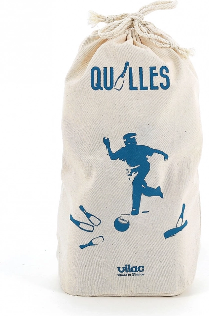 Stylowy zestaw kręgli z lakierowanego drewna do zabawy w domu i w ogrodzie. Zawiera 6 kręgli i 2 drewniane kule, wszystko schowane w praktycznym bawełnianym woreczku. Półnaturalne i półkolorowe wykończenie jest trwałe i wykonane we Francji.