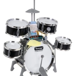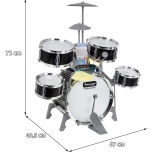 Multifunkcyjny dziecięcy zestaw perkusyjny zawiera 5 bębnów, 2 elektroniczne talerze (plastikowe) i jeden metalowy talerz, panel sterowania, mikrofon, 2 pałeczki oraz 6 kart z nutami do łatwej nauki gry. Zestaw jest zasilany trzema bateriami AA lub przewodem USB.