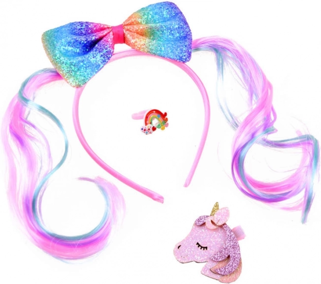 Stylowy i kolorowy zestaw akcesoriów do włosów wyczaruje bajkowy look w kilka chwil. Opaska z miękkim satynowym wykończeniem jest wygodna w noszeniu, a zdobi ją wyrazista błyszcząca kokarda w kolorach tęczy z motywem kucyków. Zestaw uzupełnia błyszcząca spinka z jednorożcem oraz uroczy plastikowy pierścionek z tęczą, które dodają stylizacji figlarnego akcentu.