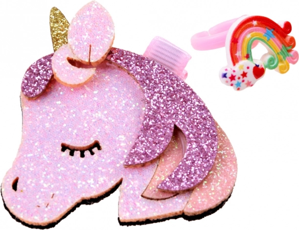 Błyszcząca spinka w kształcie głowy jednorożca trzyma włosy na miejscu i dodaje fryzurze figlarnego, baśniowego charakteru.