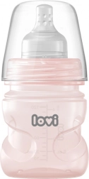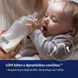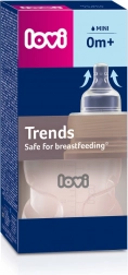 Butelka LOVI Trends powstała we współpracy ze specjalistami i jest klinicznie testowana. Specjalna dynamiczna końcówka smoczka z cienkiej warstwy silikonu podczas karmienia naturalnie wydłuża się i kurczy w tempie dziecka, natomiast sztywna, szeroka, profilowana podstawa zapewnia stabilne oparcie dla warg i zapobiega zagryzaniu. Antykolkowy system SUPER-vent ogranicza przedostawanie się powietrza do mleka, pomagając zapobiegać kolkom.