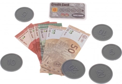 Zestaw zawiera różne rodzaje dziecięcych pieniędzy, kartę kredytową oraz szeroką gamę towarów, co dodaje realizmu w zabawie w sklep.