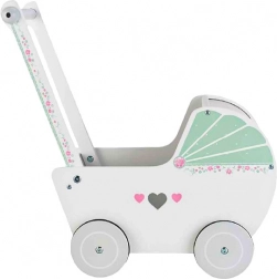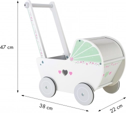 Cały wózek wykonany jest z wysokiej jakości drewna i pomalowany bezpiecznymi dla dzieci farbami.