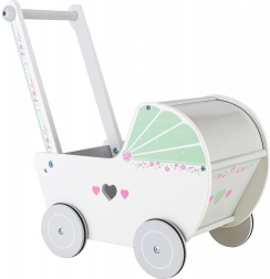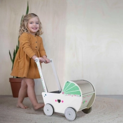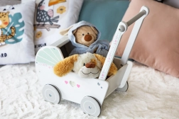 Ten drewniany wózek dla lalek to idealny prezent dla każdej dziewczynki, która kocha opiekować się swoimi lalkami i pluszakami. Wózek pozwala dzieciom bawić się w mamę, a zabawa przynosi wiele radości i wspiera rozwój wyobraźni. Wózek doskonale nadaje się do zabawy w domu, a kółka wyposażono w gumową opaskę, która chroni podłogę przed zarysowaniami.