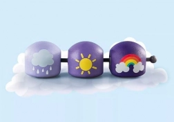 Komponenty mają zaokrąglone kształty i rozmiar idealny dla małych rączek. Zabawa wspiera małą motorykę (wkładanie, przesuwanie, łączenie i rozłączanie elementów), umiejętności językowe (nazywanie słońca, deszczu, tęczy) oraz kreatywne myślenie dzięki różnym kombinacjom budowania.