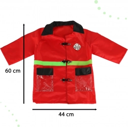 Dziecięcy kostium zawiera kurtkę, która jest zaprojektowana tak, aby wyglądała jak prawdziwa strażacka kurtka, dzięki czerwonej barwie i odblaskowym zielonym elementom.