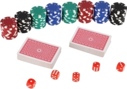 W zestawie znajdziesz wszystko, czego potrzebujesz do natychmiastowej gry: 100 szt. żetonów w podstawowych kolorach, 2 talie kart dla płynnej gry oraz 5 klasycznych kości do innych popularnych gier stołowych. Dzięki kompaktowym wymiarom zestaw jest łatwy do przenoszenia i idealny w podróży.