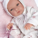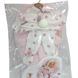 Urocze dwuczęściowe ubranko dla lalki-niemowlaka New Born o wielkości 35–36 cm zapewnia wygodę i styl w każdej zabawie. Zestaw obejmuje bluzkę z długim rękawem i spodnie we wzór gwiazdek i króliczka, uzupełnione o miękką podkładkę z trzypunktowym mocowaniem do bezpiecznego przenoszenia lub odpoczynku lalki. Ręcznie wykonane w Hiszpanii z przyjemnych materiałów, idealne do kreatywnej i opiekuńczej zabawy dla dzieci od 3 lat.