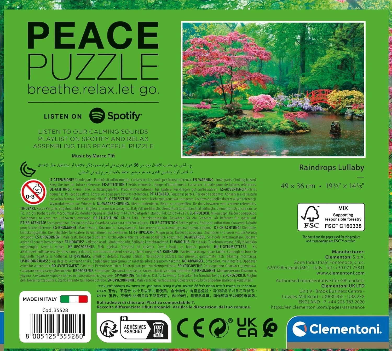 Odkryj kojące układanie z puzzlami 500‑elementowymi z serii Peace Collection. Wysokiej jakości wykonanie, gruba tektura, precyzyjne wycięcia oraz znakomity druk zapewniają płynne układanie i piękny efekt końcowy. W zestawie znajduje się plakat z wzorem, wskazówki dotyczące relaksu i ukojenia umysłu oraz link do playlisty na Spotify z muzyką relaksacyjną.