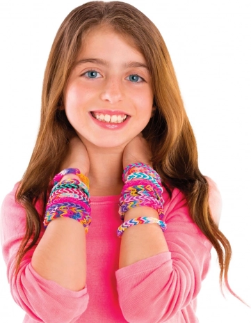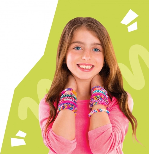 Kreatywny zestaw do bransoletek: krosno, szydełko i 600 kolorowych gumek. Wspiera motorykę i wyobraźnię. Kompaktowe pudełko 27×13×4 cm, od 3 lat.