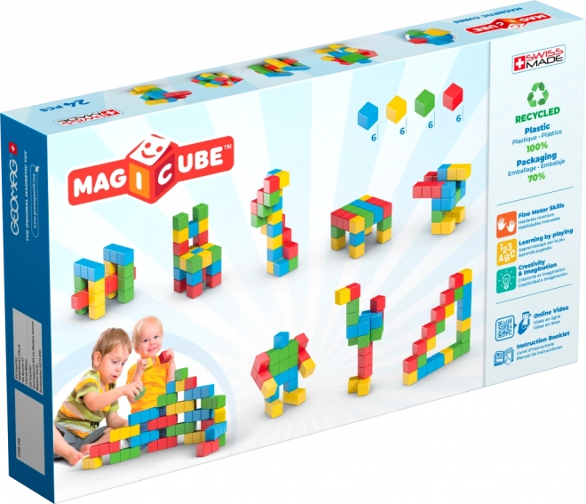 Odkryj kreatywny świat z magnetyczną układanką Geomag Magicube Creative. Dzięki specjalnej konstrukcji kostki przyciągają się ze wszystkich sześciu stron i umożliwiają budowanie w 3D oraz swobodne łączenie w przestrzeni. Zestaw zawiera 24 kolorowe kostki i jest odpowiedni już od 1. roku życia – idealny do rozwoju wyobraźni, małej motoryki i koordynacji.