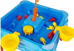 Duża wodna gra wędkarska zamieni każde popołudnie w wesołe łowienie. Napełnij niebiesko–pomarańczowy stolik wodą, wrzuć rybki i za pomocą mechanizmu uruchom prąd, aby wesoło krążyły. Dwóch graczy rywalizuje, kto złowi ich więcej. Gra rozwija małą motorykę, koordynację ręka–oko i koncentrację.