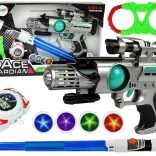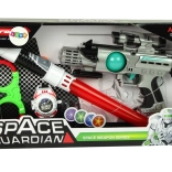 Zestaw kosmicznych broni Space Guardian to pełny pakiet dla wszystkich małych poszukiwaczy przygód. Jest wyposażony nie tylko w laserowy pistolet, ale także świetlny miecz, kajdanki i wyrzutnik dysków dla kompleksowego doświadczenia w grze. Dzięki efektom świetlnym i dźwiękowym zabawa z tym zestawem jest bardziej angażująca i kreatywna.