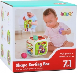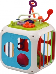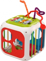 Dziecko może ćwiczyć rozpoznawanie kształtów i kolorów, wkładając kostki do odpowiednich otworów w sortującej kostce. To doskonały sposób na rozwijanie umiejętności manualnych i koordynacji ruchowej. Wyjmowana ściana kostki skrywa dodatkowe atrakcyjne elementy, takie jak cymbałki, koła zębate i sznurki do interaktywnej zabawy.