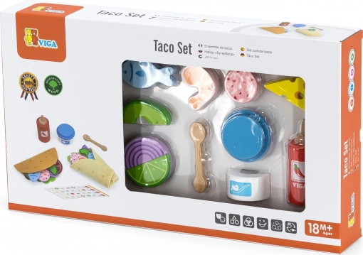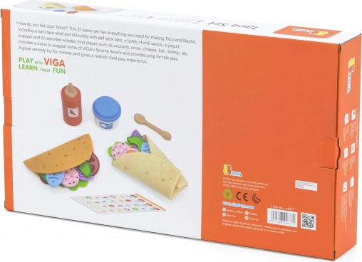 Zestaw VIGA do taco i burrito dostarcza dzieciom autentycznych wrażeń z gotowania. Miękkie filcowe tortille i kolorowe drewniane elementy żywności (warzywa, ser, ryba itp.) zachęcają do mieszania smaków i tworzenia własnych przepisów. Dzięki akcesoriom takim jak butelka z sosem, miseczka „jogurtu” i drewniana łyżeczka zabawa jest jeszcze ciekawsza.