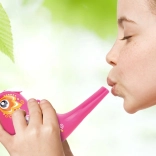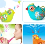 Ten wesoły ptasi gwizdek działa jak klasyczny gwizdek oraz jako wodna zabawka muzyczna. Po nalaniu wody przez otwór w górnej części, podczas dmuchania zaczyna czarująco ćwierkać – wysokość i barwę tonu determinuje ilość wody oraz siła dmuchnięcia. Bez wody wydaje czysty i głośny dźwięk.