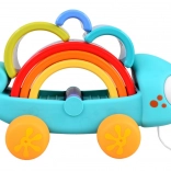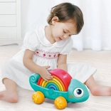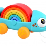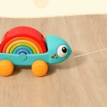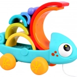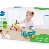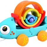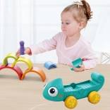 Kameleon wspiera zabawę przez ciągnięcie i układanie, gdzie każdy element interakcji wzmacnia umiejętności dziecka.
