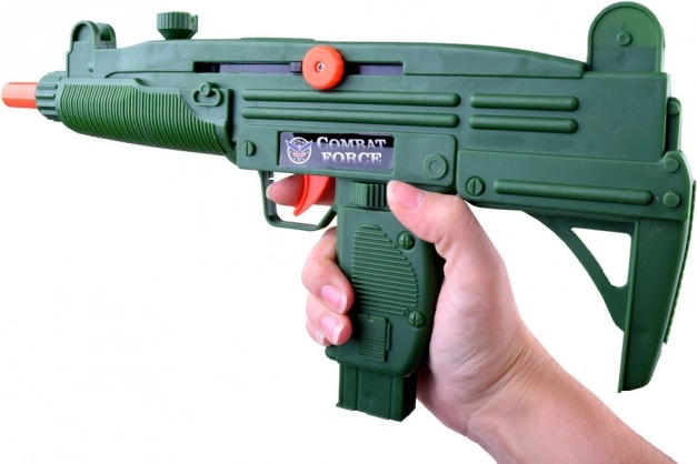 Krótki pistolet z efektami dźwiękowymi (baterie AG13 w zestawie) oraz naciągana strzelba dla pełnych akcji wrażeń przy bezpiecznej zabawie.