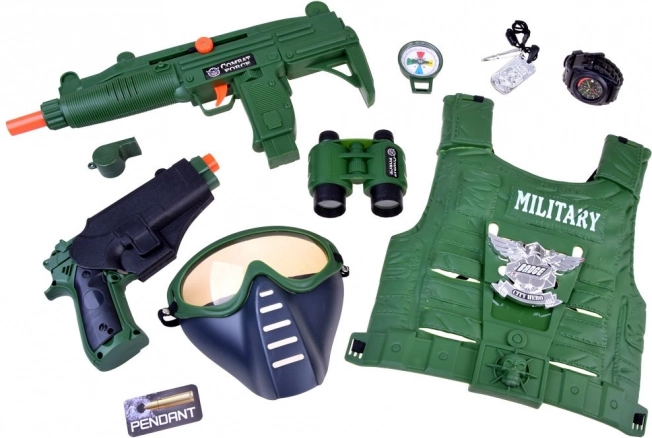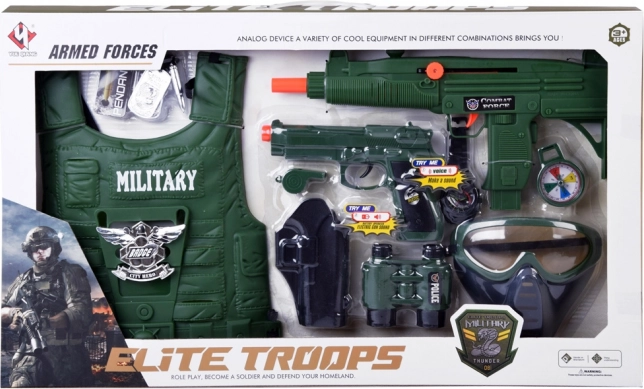 Dziecięcy wojskowy zestaw z kamizelką taktyczną i bogatymi akcesoriami do realistycznej zabawy w żołnierzy. Zawiera plastikową kamizelkę, dwie zabawkowe bronie z efektami dźwiękowymi, maskę, lornetkę, kompas, zegarek oraz inne dodatki do aktywnej i kreatywnej zabawy.