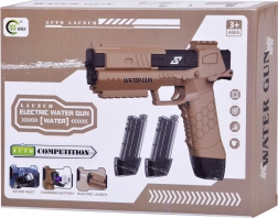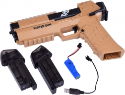 Elektryczny pistolet na wodę do letnich potyczek: automatyczny strumień wody bez pompowania, ergonomiczny chwyt i 2 wymienne zbiorniki. Akumulator 3,7 V 500 mAh z wygodnym ładowaniem USB zapewni długą, bezpieczną zabawę na świeżym powietrzu dla dzieci i dorosłych.
