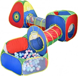Ten elastyczny zestaw namiotów z tunelami zapewnia dzieciom bezpieczną przestrzeń do czołgania się, chowania i aktywnej zabawy. Namiot trójkątny ma tarczę do rzucania z 4 piłeczkami na rzep, kwadratowy namiot umożliwia łączenie tuneli, a kosz na piłeczki w baseniku wspiera celność i koordynację. Dzięki panelom z siatki wewnątrz jest przewiewnie, a rodzice mają dobrą widoczność.
