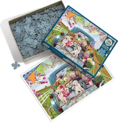Puzzle przedstawiają żywą, wiejską scenę z niebieską, zabytkową furgonetką, kwiatami i szczeniętami.