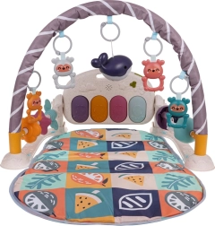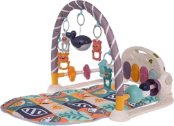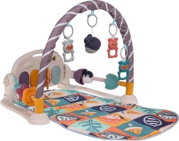 Pianinko z 4 podświetlanymi klawiszami i przyciskiem melodii można odchylać w kilku pozycjach, wyjąć z maty i dzięki rączce zabierać ze sobą. Pałąk oferuje 4 wiszące grzechoczące misie oraz świecącego delfinka, boczne koralikowe elementy przesypowe rozwijają małą motorykę. Głośność można wygodnie regulować.