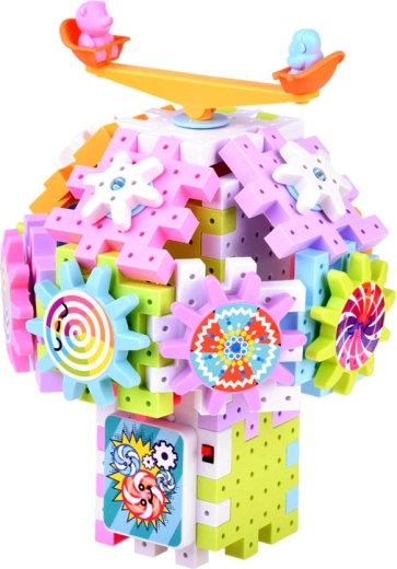 Zestaw do złożenia zawiera zębatki i małe łopatki z figurkami zwierząt, które mogą się obracać, co rozwija koordynację i zdolność rozwiązywania problemów.