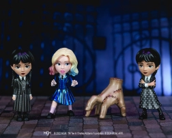 Figurki uchwytują ulubione postaci serialu, takie jak Ręka Thing i Wednesday w różnych strojach.
