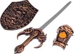 Miecz o długości 50 cm i tarcza o wymiarach 29 x 20 cm pozwalają dzieciom bezpiecznie walczyć z wyimaginowanymi przeciwnikami, bronić się i przeżywać sytuacje bojowe jak prawdziwi rycerze.