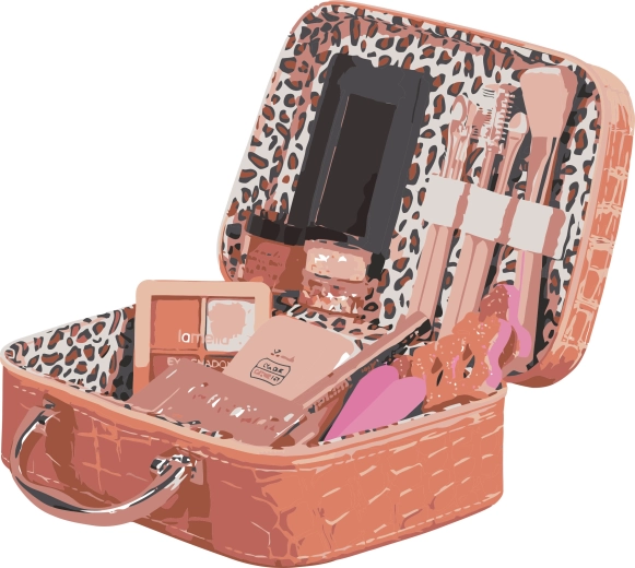 Kuferek z kosmetykami. Rozmiar 19 cm. Zawiera lusterko, sztuczne paznokcie, błyszczyk do ust, róż do policzków, cienie do powiek, pilniki do paznokci, zestaw pędzli, balsam do ust, eyeliner, brokatowe dekoracje.