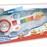 Efekty świetlne dodają zabawie energii przy każdym graniu. Zasilanie: 3 baterie R6 / AA 1,5 V, nie dołączone do zestawu. Gitara jest odpowiednia dla dzieci od 1,5 roku, wymiary: 17 x 40 x 5 cm.
