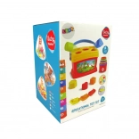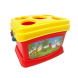 Wiaderko z pokrywką służy jako sorter kształtów z motywami zwierząt, co umożliwia interaktywną zabawę oraz rozpoznawanie kształtów i kolorów.