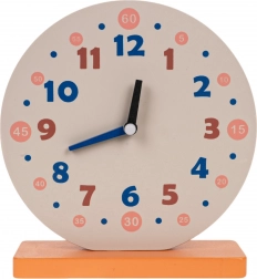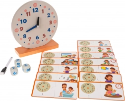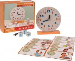 Edukacyjny zestaw Zegar z akcesoriami został zaprojektowany tak, aby dzieci łatwo zrozumiały pojęcie czasu. Zawiera duży drewniany zegar z ruchomymi wskazówkami, trzy kostki z różnymi wartościami czasu oraz 24 dwustronne elementy do układania. Dzieci mogą uczyć się odczytywania godzin, ćwiczyć pamięć i koncentrację — wszystko w formie zabawy.