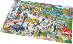 Odkryj świat policji w zabawnej i pouczającej książce dla dzieci, która wspiera opowiadanie historii i rozwój wyobraźni. Dzieci zajrzą na komisariat policji, będą śledzić poszukiwania złodziei biżuterii, rozwiązywać problem dzikiego wysypiska nad rzeką oraz szukać zaginionego pieska. Ta interaktywna książka rozwija słownictwo, uważność i logiczne myślenie poprzez wciągające opowieści z codziennej pracy policji.
