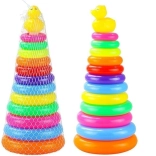 Kolorowe pierścienie podczas układania pomagają rozwijać umiejętności motoryczne i ruchowe.