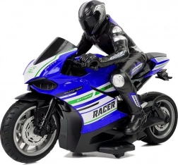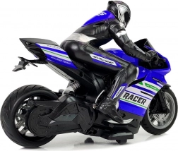 Dopracowane detale motocykla z kierowcą, sportowymi naklejkami i działającymi kołami dla autentycznych wrażeń z jazdy.