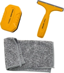 - Kompletny zestaw akcesoriów – ściągaczka, gąbka, ściereczka