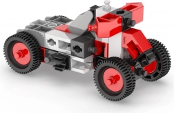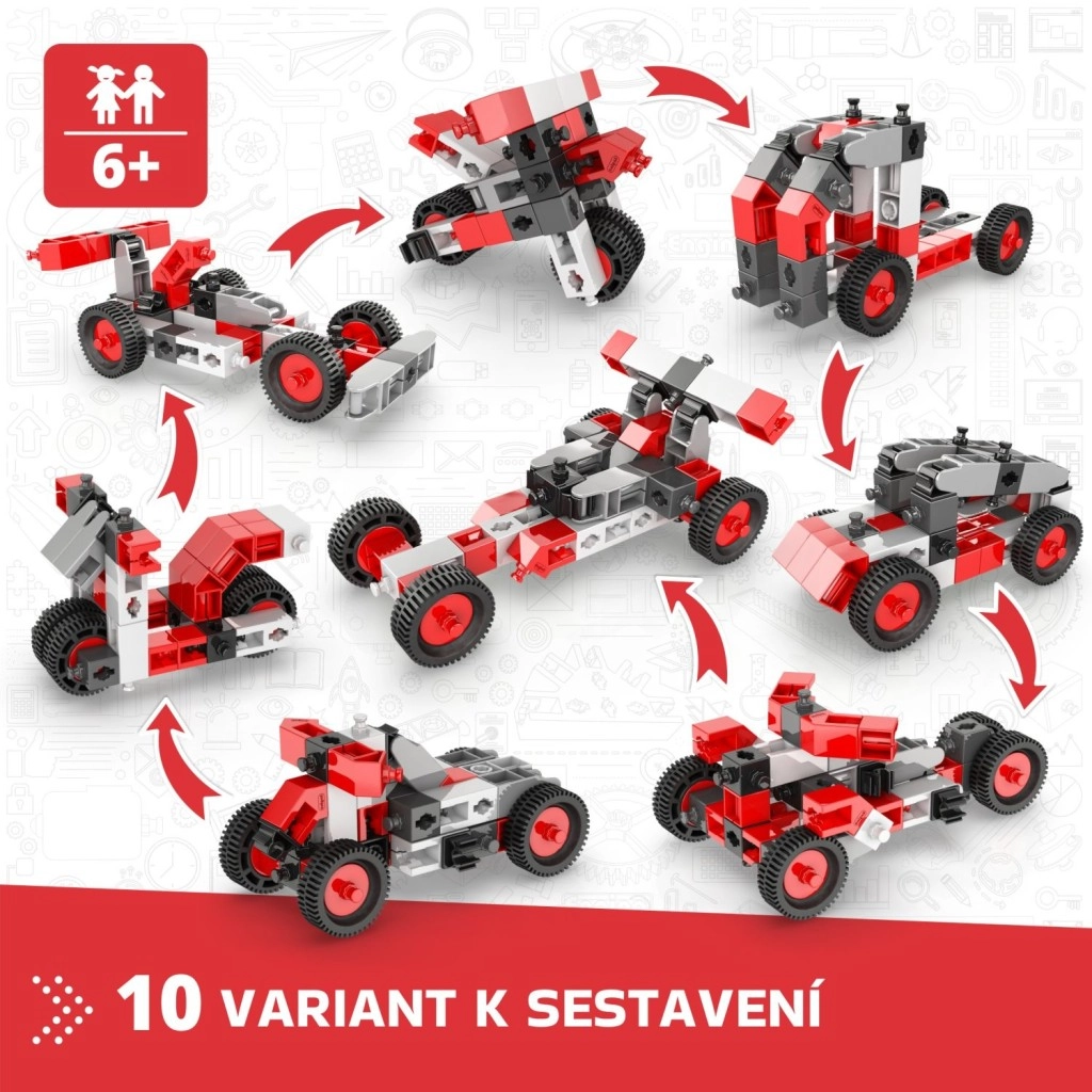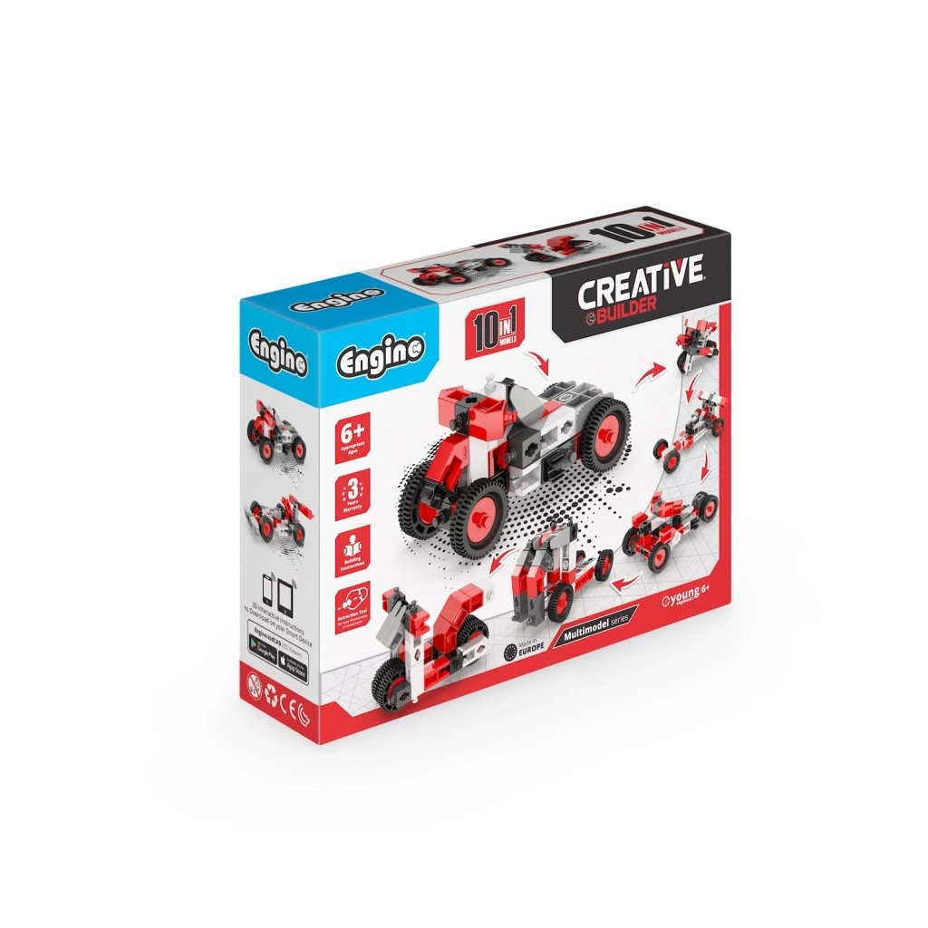 Ten zestaw ENGino Creative Builder łączy świat techniki i wyobraźni. Z solidnych plastikowych elementów w czerwono–biało–szarej kolorystyce zbudujesz motocykle, buggy czy małe auta, a dzięki przemyślanemu systemowi kół i złączy w mig przebudujesz je na kolejny model. Jedno pudełko, 10 modeli i nieskończone godziny zabawy.